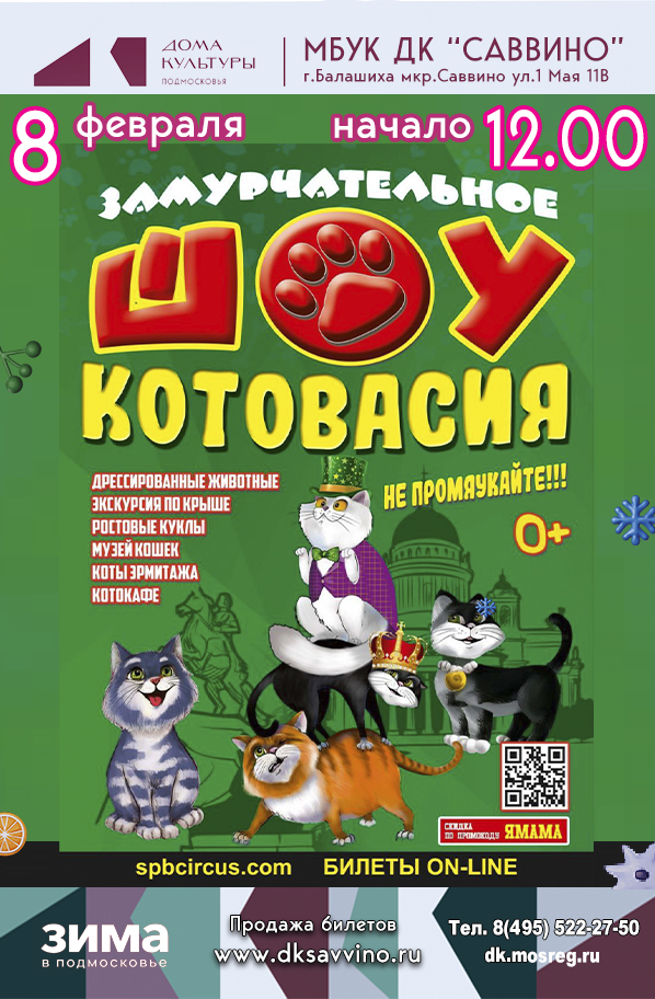 Вместе с котом Рыжиком вы окажетесь на крыше Эрмитажа, где встретитесь с его друзьями Вальдемаром, Валентином и Батоном.Они покажут и расскажут, кто обитает в разных уголках Петербурга. Вы отправитесь в котокафе и посмотрите представление с участием: мышей, козы, кур, носух и голубей. А также вы убедитесь, что ленинградские коты очень хорошо ладят с собаками. Световое шоу зажгет огни Зимнего дворца. Настоящий восторг вызовет шоу мыльных пузырей от наших замурчательных героев. Продолжительность представления 1 час 10 мин.